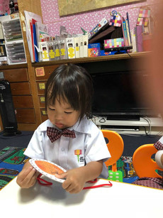 The class did the standard JEC warm up and practice the self introduction. Today's lesson is story telling about The Very Hungry Caterpillar and the activity is lacing fruits from the Very Hungry Caterpillar story.